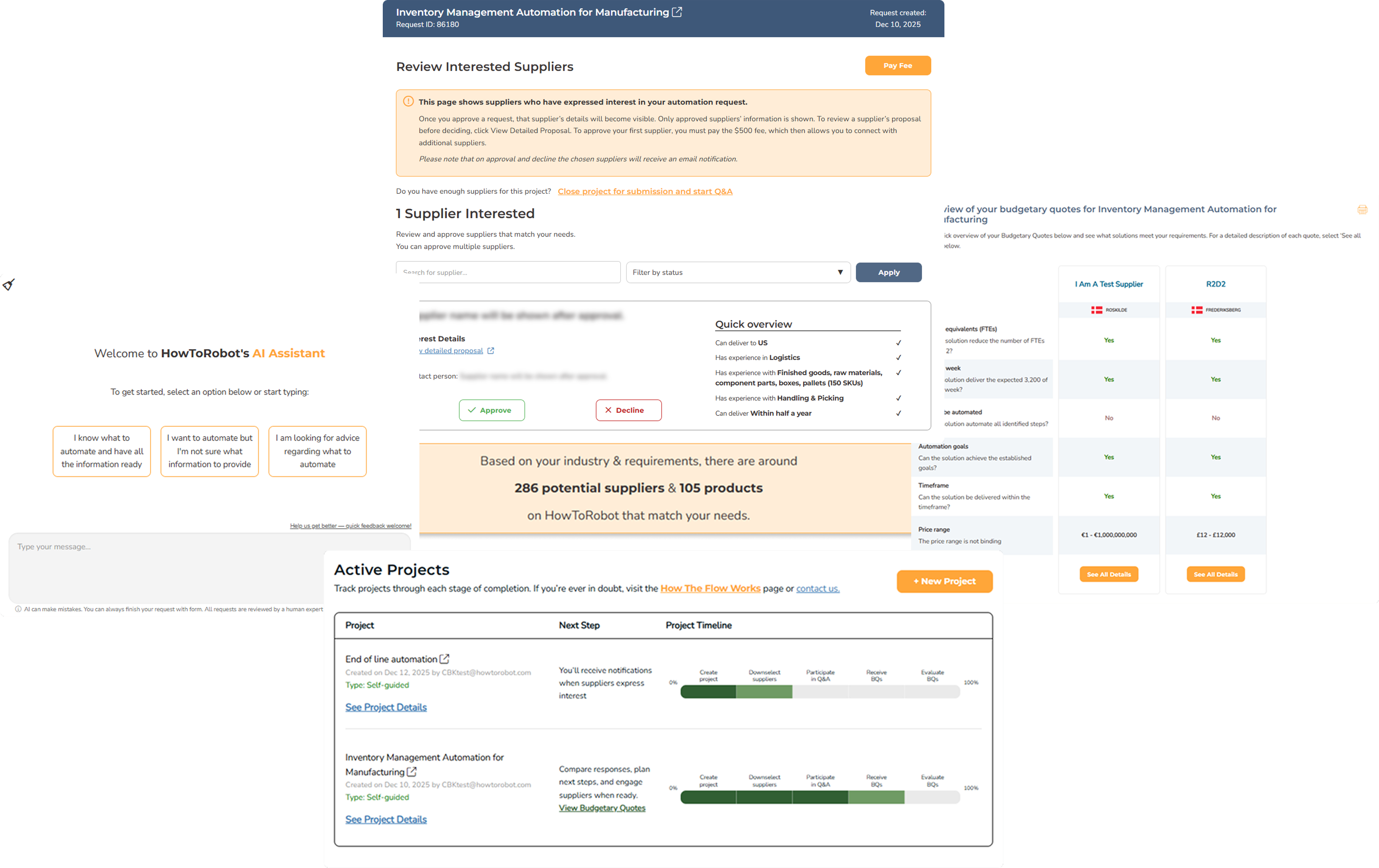 Self-guided: Use the platform to define requirements, match suppliers, and receive budgetary quotes proposals. Expert-assisted: Add an impartial expert to accelerate scoping, supplier Q&A, and downselection.