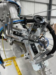 The robotic tubing bender was designed and built to automatically pick, inspect, bend and outfeed a medical component. A six axis