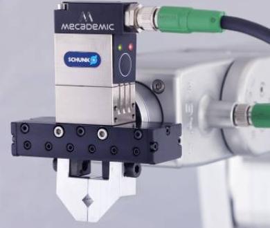 Developed in collaboration with SCHUNK, Mecademic’s MEGP 25LS electric gripper is fully integrated with the Meca500 robot. In addition to using integrated open and close commands, you can adjust the force and velocity of the grip. The electric gripper is supplied with an adapter plate. You can choose between two cables: one with 90° connectors or one with straight connectors (as shown above).