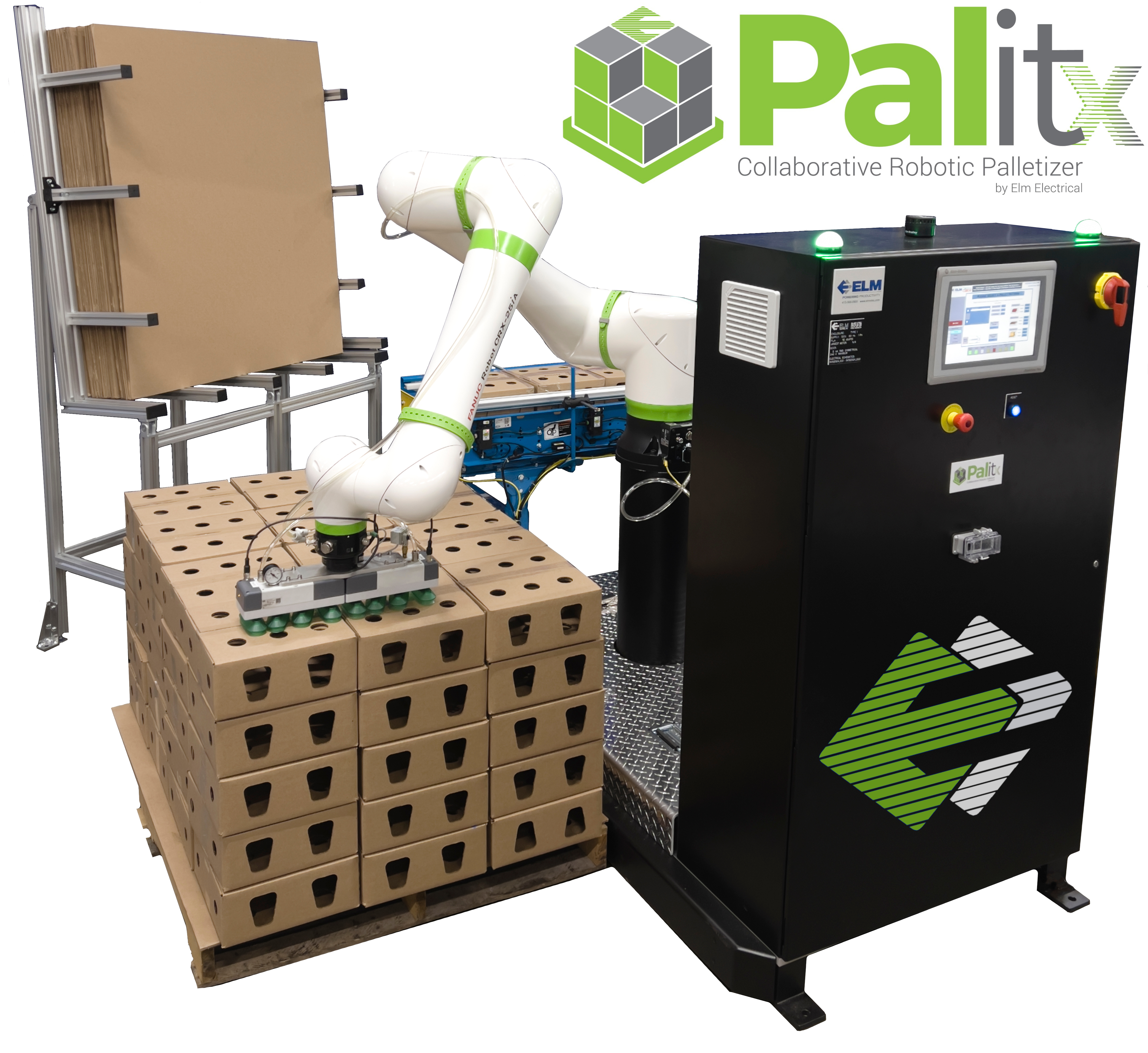 Collaborative end of line palletizers utilizing the Fanuc CRX-30iA robot. Elm Electrical specializes in advanced palletizing and material handling solutions that boost productivity and reduce the need for manual labor. Offering both Industrial and Collaborative Robotic systems, Elm’s solutions are adaptable to a range of production environments. Their collaborative product line includes the Palit and Palitx models, designed for close human-robot interaction and capable of handling 50kg and 30kg loads, respectively. These systems automate tasks like heavy lifting, precise stacking, and efficient transport, enhancing workflow efficiency and delivering reliable, consistent material handling throughout operations